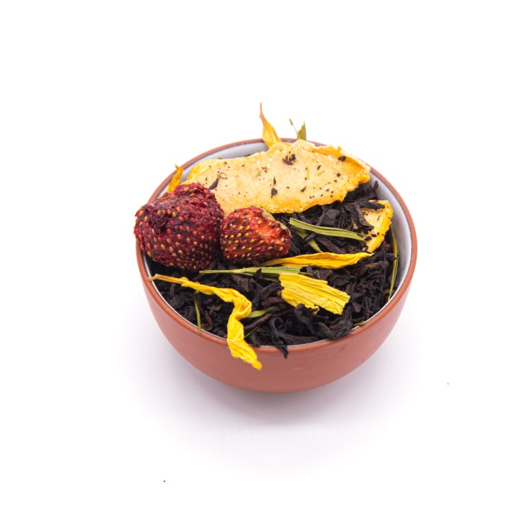 Чай черный индийский, ягоды клубники, слайсы дыни, листья бамбука, лепестки подсолнуха, аромат клубники и дыни