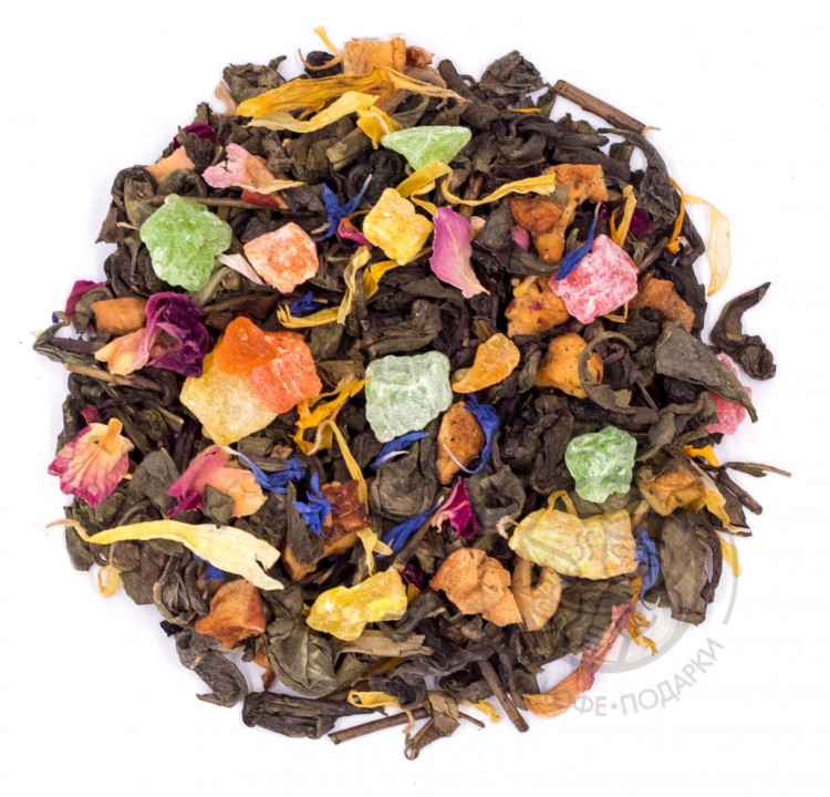 Чай зеленый китайский крупнолистовой, кусочки ананаса, кусочки папайи, кусочки яблок, лепестки розы красной, лепестки календулы, лепестки василька, аромат фруктового сада